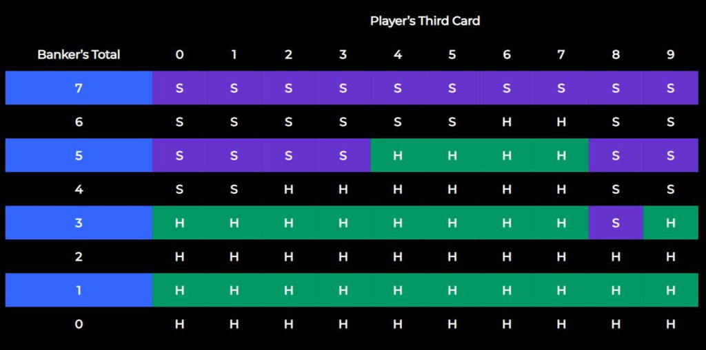 - Jika total kartu banker adalah 6 maka banker menarik kartu ketiga jika kartu ketiga player adalah 6 atau 7.